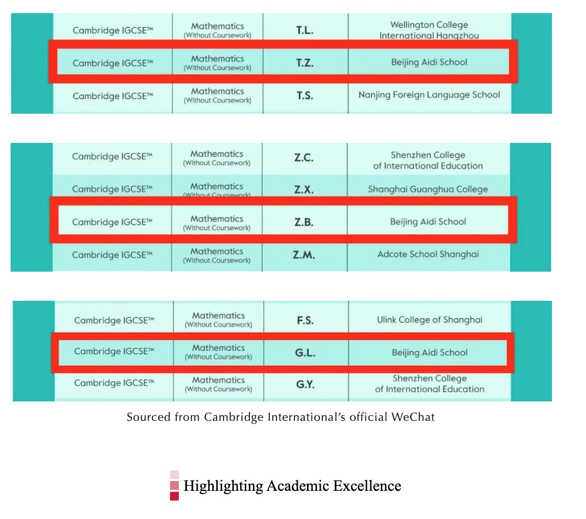 Recently, Cambridge Assessment International Education (CAIE) announced the global recipients of this year’s Cambridge IGCSE awards.?Three students from Beijing Aidi School were honored with the Outstanding Cambridge Learner Awards?for their exceptional academic performance, a distinction that highlights the academic strength and excellence of Aidi students on the international stage.